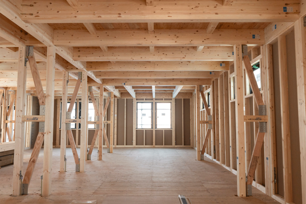 従来、木造3階建ての事務所では、1階部分に多数の耐力壁が必要となり、開放的な空間を設計することが難しくなります。