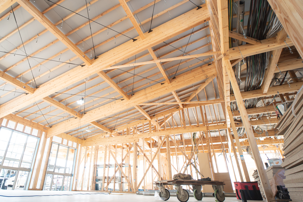 多くの人が集まるこの施設は、空間をより広く開放的に感じられるよう、登り梁を使用した勾配天井が用いられています。