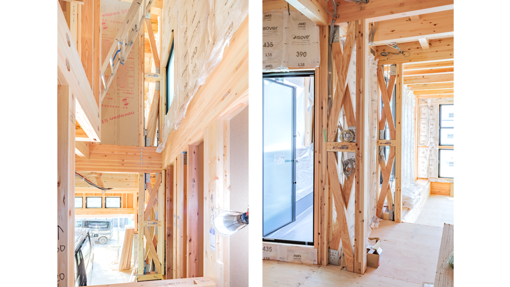 新・つくば耐力壁〈X型〉は、壁下地面材を併用せず~に相当壁倍率7.0倍を確保できる高性能仕様で、室内でも高い耐力を