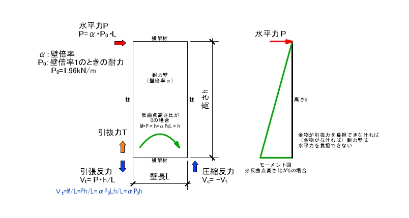 耐力壁に水平力が作用したとき、支点反力V(引張・圧縮)は水平力P × 壁高さh/支点距離(壁長)Lで求められます。