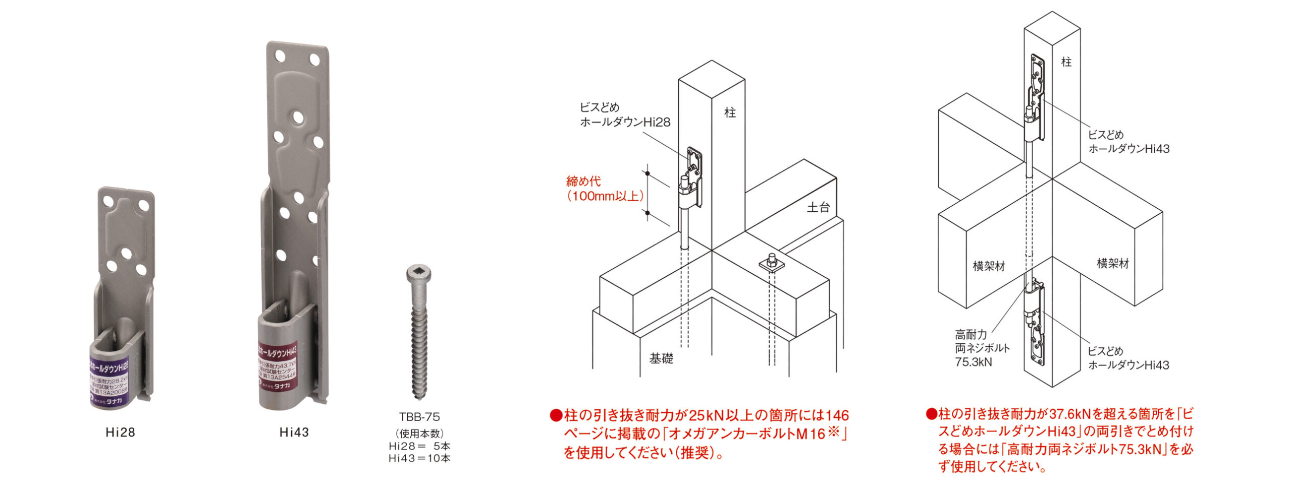 Hi28、Hi43の2種類で、Hi28は28.2kN、Hi43は43.7kNまでの引抜き耐力に対応するビスどめホールダウン金物です。