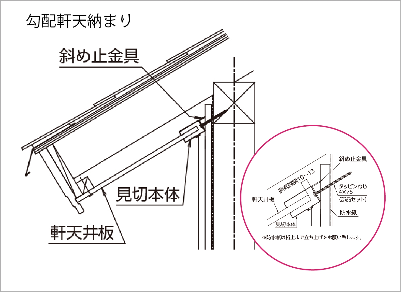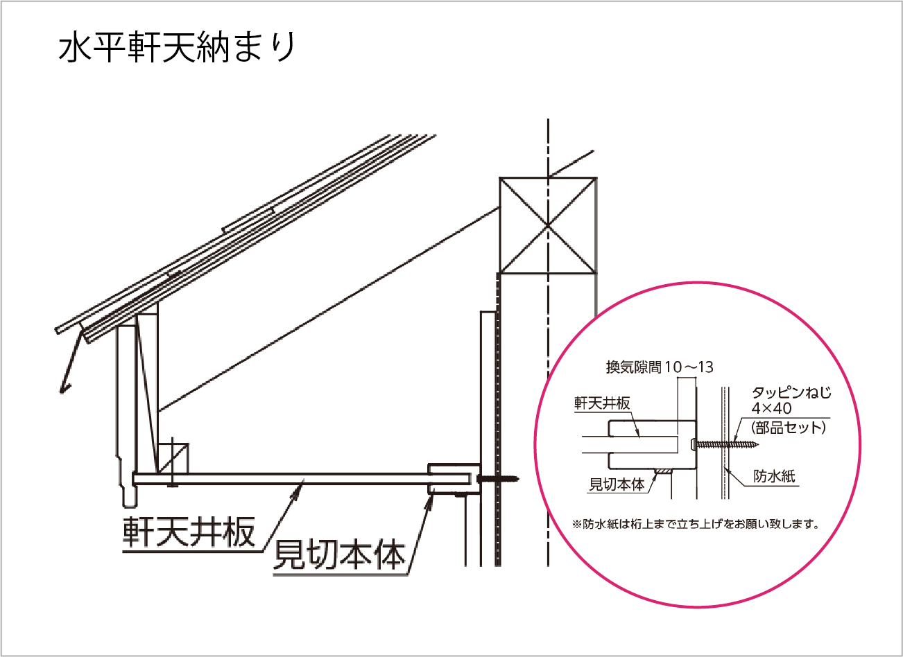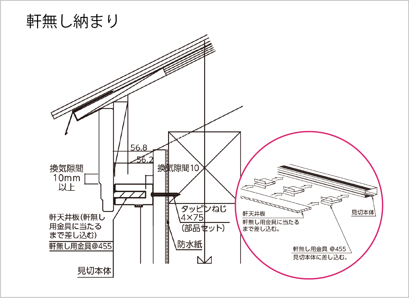 ④軒天井板は、防火通気見切り縁に差し込むだけで簡単に施工ができます。