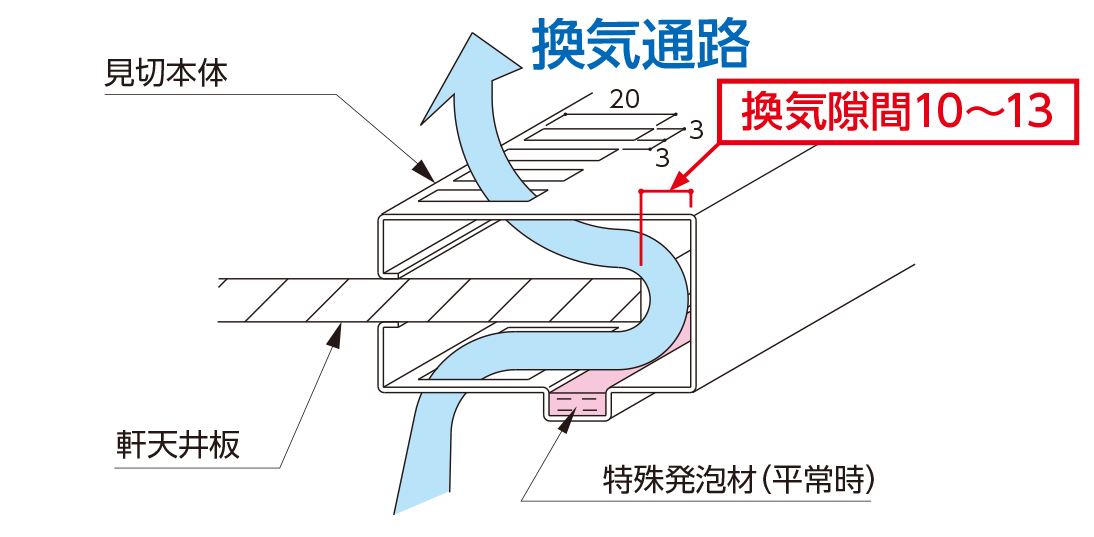 ②防火通気見切り縁は、従来の部分的換気方式と異なり建物全周で理想的な換気ができます。